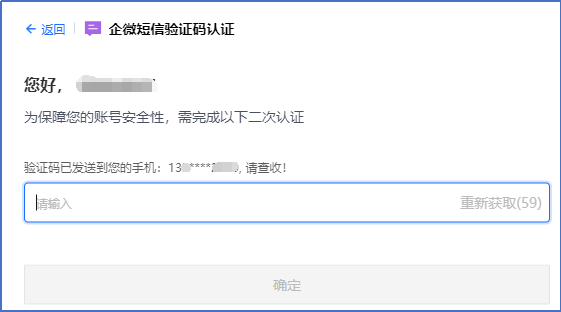 3. 根据国家相关政策,需要进行二次认证,方法如下:输入企业微信消息短信验证码,进行二次认证,如图2,验证码信息见企业微信短信,如图3.