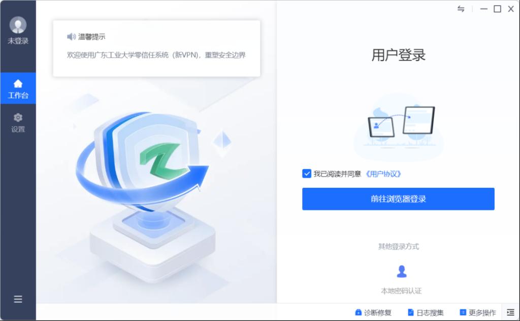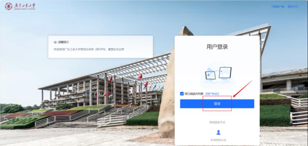 1.下载零信任客户端,浏览器访问链接https://vpn.gdut.edu.cn/,页面右上角点击下载客户端。